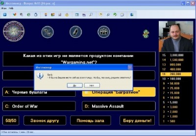 Данная игра - бесплатный аналог телешоу "Кто хочет стать миллионером?". Игра поддерживает звук (для этого нужно скачать со страницы игры и распаковать в папку игры архив со звуками), показ заранее подготовленных фотографий в начале игры и во время выигрыша несгораемых сумм или после каждого правильного ответа